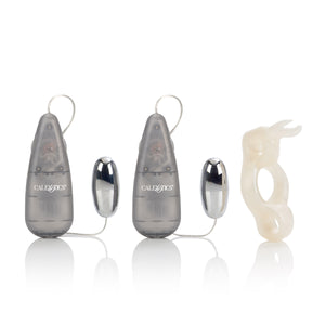 Sturdy erection enhancer with vibrating ears and tail Two multi-speed bullets dual controls for independent use PVC (enhancer) ABS with silver plating (bullets) 4 AA batteries